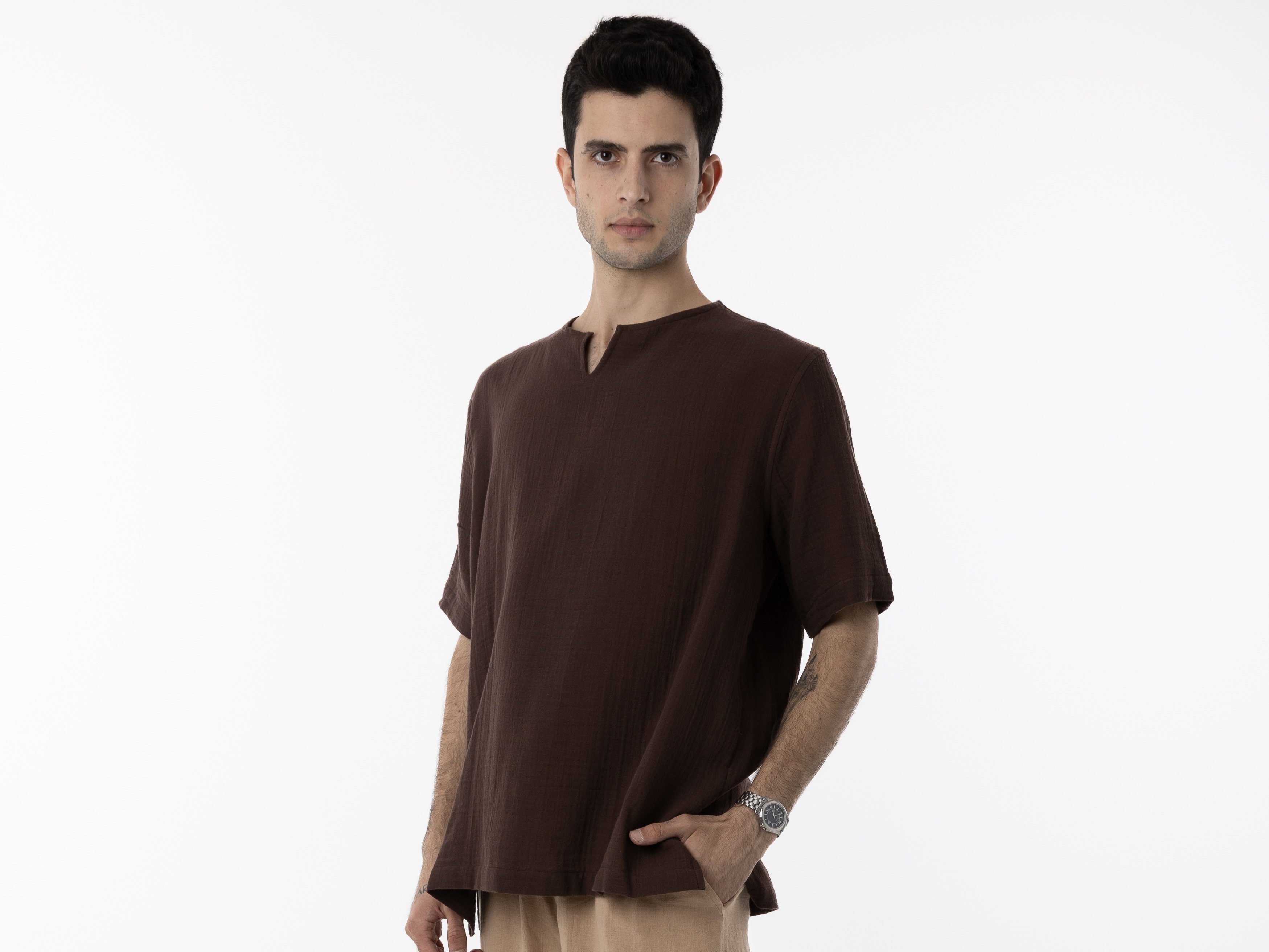 Şıklığın ve rahatlığın en doğal hali: Acı Kahve T-shirt. Zengin ve sofistike acı kahve tonu, şehir hayatına modern ve özgün bir dokunuş katıyor. %100 pamuklu dokusu sayesinde cildiniz nefes alır, yazın bunaltıcı sıcaklarında bile kendinizi serin ve rahat hissedersiniz. Oversize ve salaş kesimi, özgür ruhlu bir duruş sergilemenizi sağlar. İster kot pantolonla, ister şortla kombinleyin, her an özgüvenli ve havalı hissedersiniz. Bu T-shirt sadece bir giysi değil, minimalist ve modern tarzınızın bir yansımasıdır.